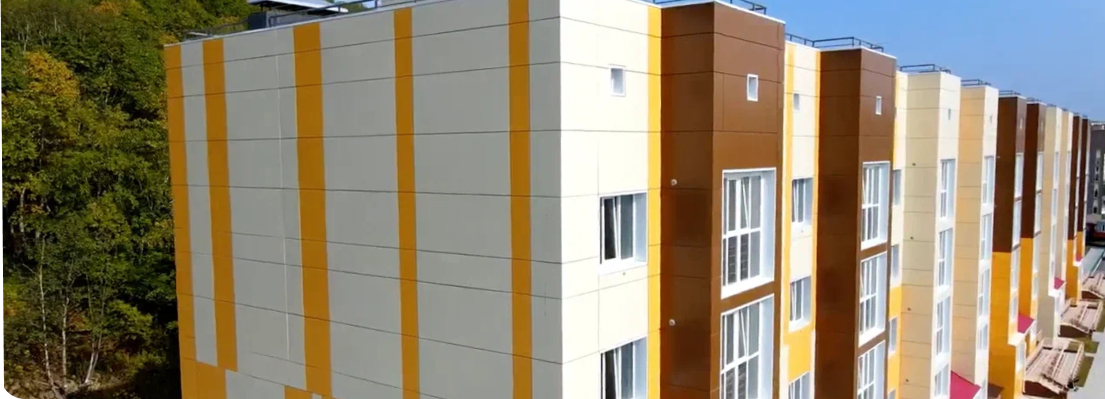 Учли контекст сложившейся застройки, и переосмыслив ее геометрию, применили модный строгий тектонический стиль с использованием природных цветов Камчатки